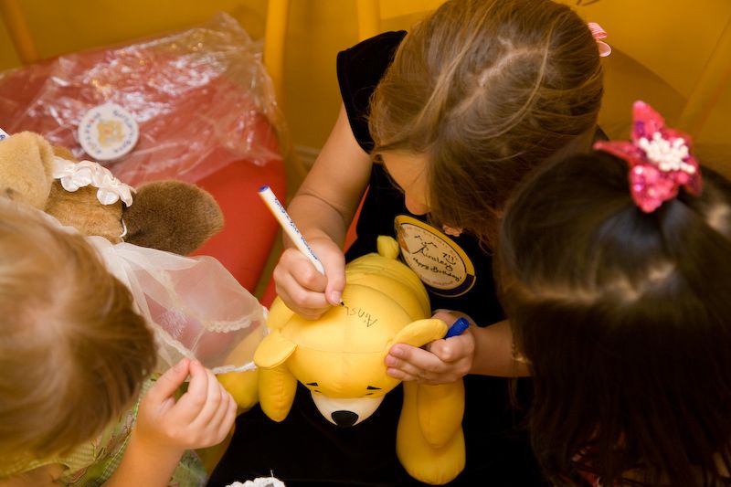 Everyone signs a bear for Ainsley.