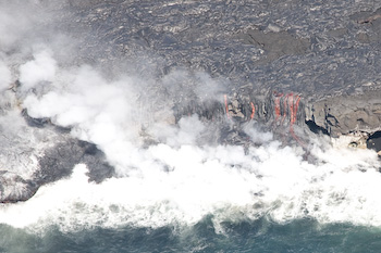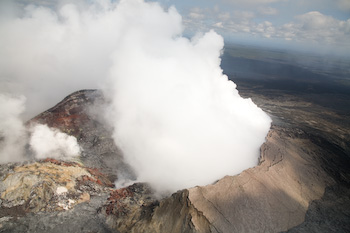 left. The Kilauea crater steams sulfur dioxide gas. Our