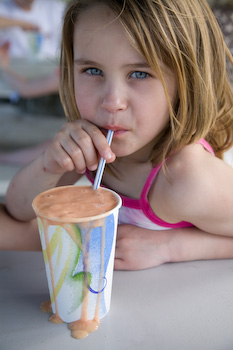 Ainsley drinks her fruit smoothie during lunch at What's