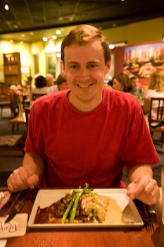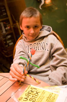 Ryan plays with colored wax strands before dinner arrives. Jeff