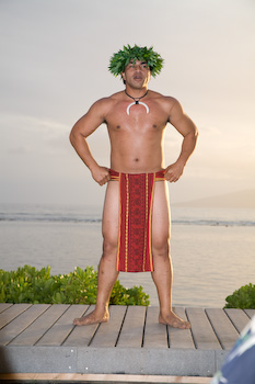 Some of the costumes at the luau with the sunset and island of Lanai
