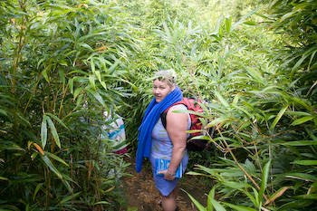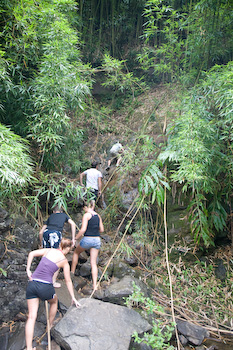 a fallen bamboo tree as a rope to scale up the wet and muddy rock about