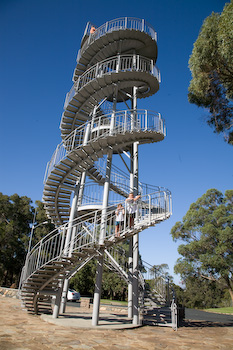 The Old Swan Brewery on the Swan River as viewed from Kings Park (left)