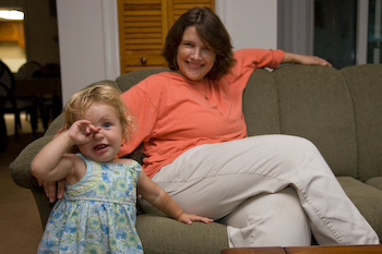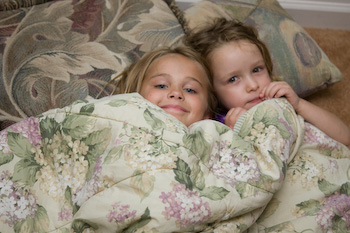 Ainsley and Remy play in the family room after borrowing the bedspread