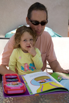 Remy digs for gold while Mark reads one of the Dora the Explorer books. Betsi,