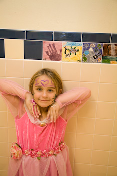 Ainsley stands underneath a tile she decorated in 2004