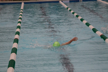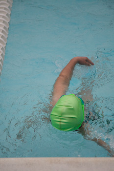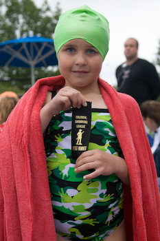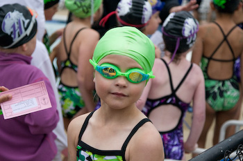 This is Ainsley's first swim meet after weeks of practice. She displays her ribbon for winning the heat in the 25m backstroke. I should have taken the photo from the other end of the pool. |