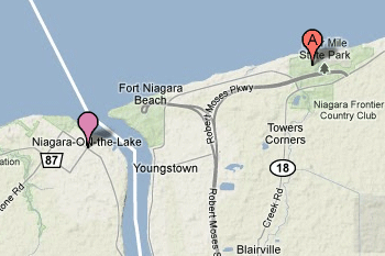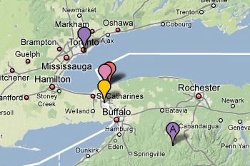 (purple "A"), Niagara Falls (yellow), and Toronto, Canada. We