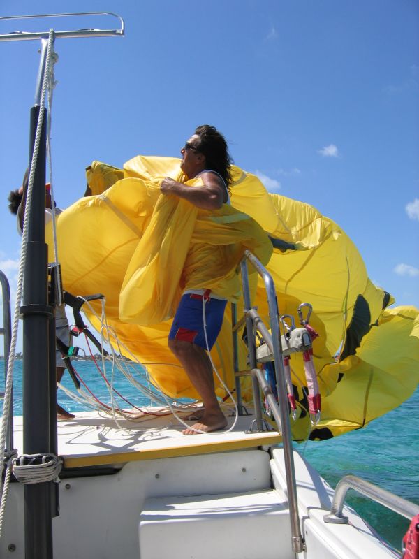 Grabbing the deflating parasail before it hits the water.