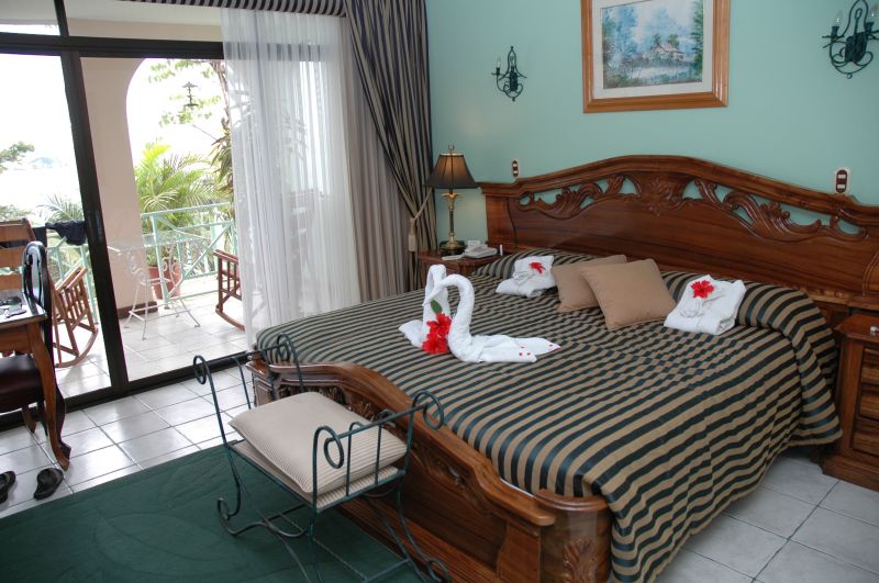 Our room at La Mansion Inn in Manuel Antonio near Quepos. The bath towels are folded like two swans on our bed.