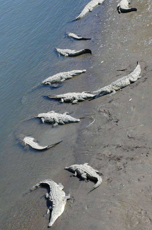 Crocodiles near Tarcoles. It's a popular spot for tourists to park their car at the end of the bridge and walk to the middle to see these sun bathers.
