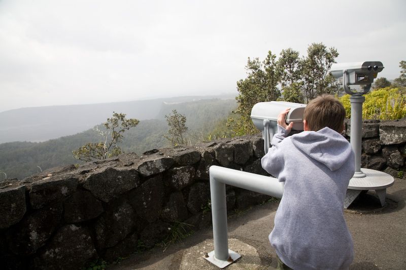 Observation point at the Volcano House, a hotel at the edge of the crater. The hotel looks like it hasn't been updated in 40 years.