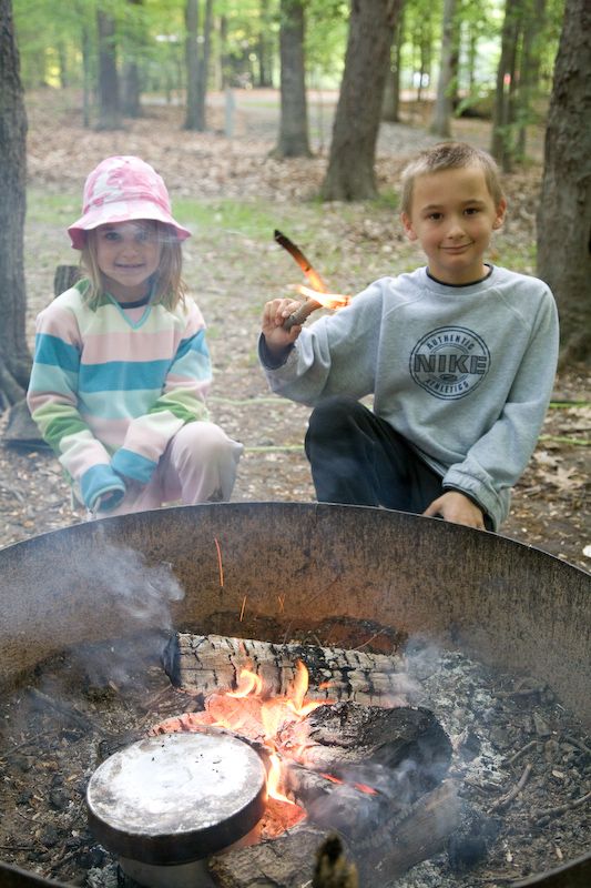 The kids set poker sticks on fire, but keep them in the fire ring. The pot heats water for hot cocoa before breakfast.