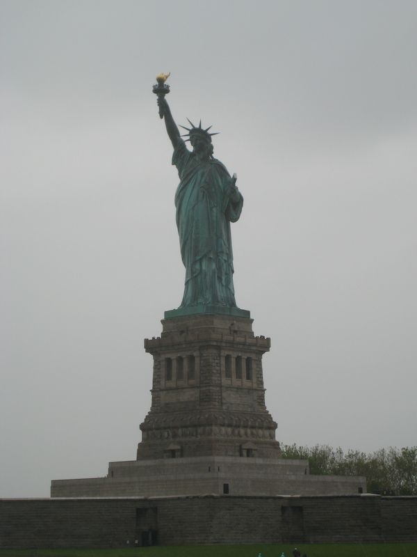 A rain soaked Statue of Liberty.