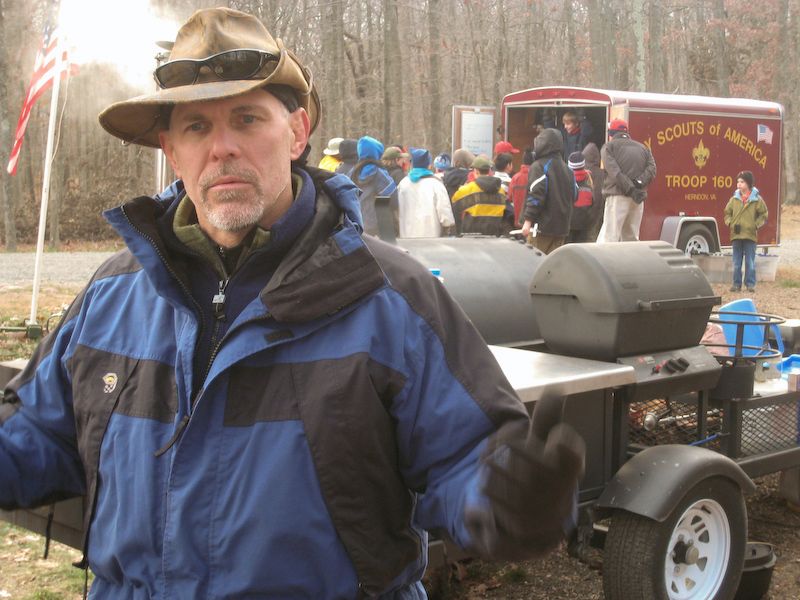Dave Z. talks to the adults about joining this Boy Scout troop while the boys get a tour.