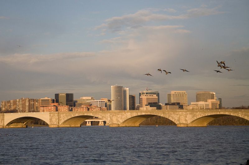 The Memorial Bridge leading to Arlington National Cemetery on the left and Rosslyn, Virginia beyond the bridge. I used to work in the short, black building on the left.