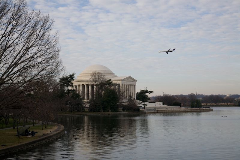 The kids and Jeff took a walk around the Tidal Basin during the race. A plane approaches Reagan-National.