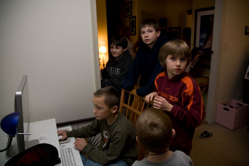 Andrew, Zack, Roy (with short hair), and Tucker gather around Ryan.