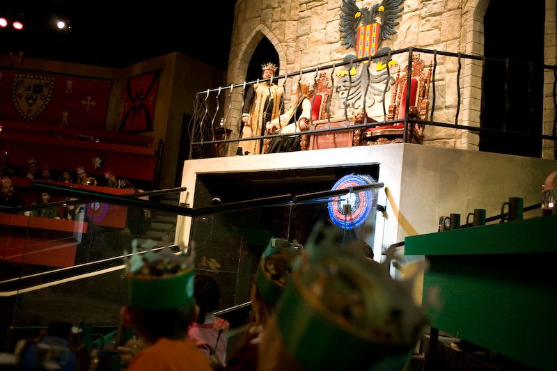 and lands a bulls eye in the target as he continues through the passageway under the king.