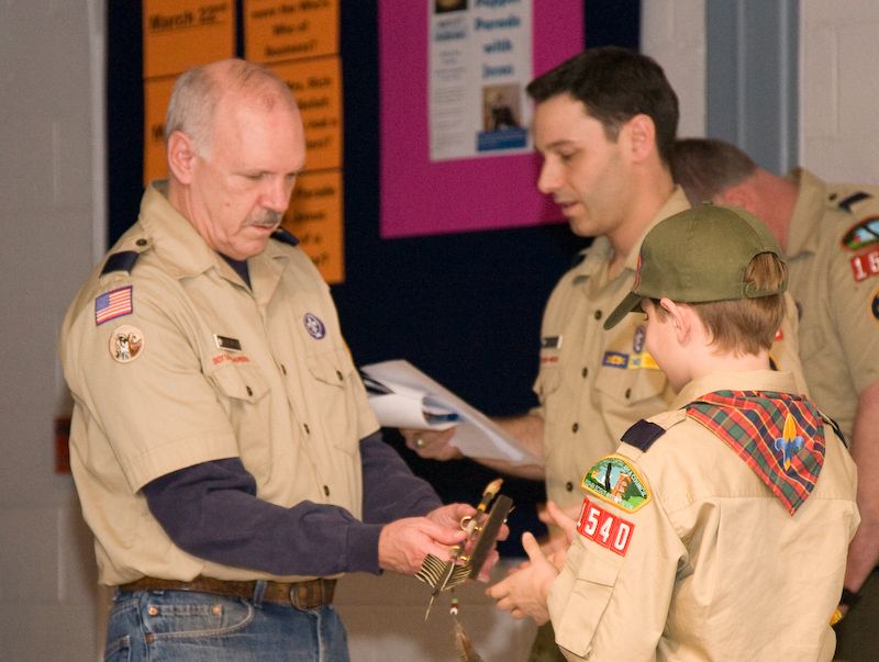 Tim C. receives an arrow and plaque for the Arrow of Light from Bob as Mike reads his list of earned acheivements over the past 5 years.