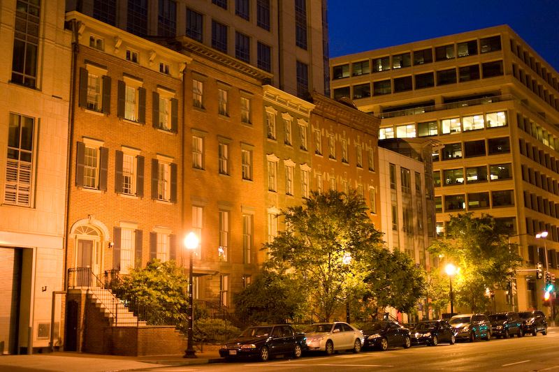Townhouses sandwiched between office buildings.