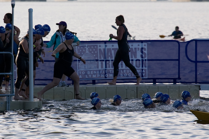 Laurie jumps in. Out of a hundred bobbing blue heads, Jeff could not find them again.