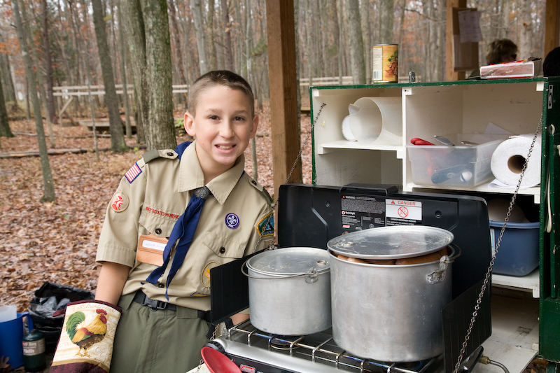 Louis and some of the other scouts cook lunch for the troop for his cooking requirement.