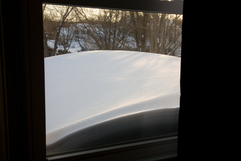 The snow is covering part of the bedroom window.