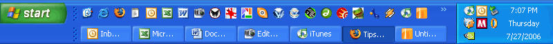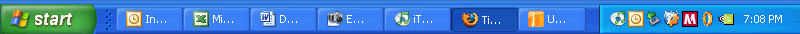 Add and Arrange the Quick Launch Toolbar![]() Does your desktop look like this? ![]() Change it to look like this. This setup allows the fastest way to launch applications, keeps my desktop icon free, shows the date/day/time all at once, and shows longer descriptions of open applications. Show the Quick Launch toolbar: Anywhere in the blue area, single click the right mouse button to bring up a shortcut menu. Click on toolbars. If the check mark next to Quick Launch is missing, then single left mouse click on top of Quick Launch. Enlarge to double height: On the blue bar above the green Start Menu button, click and drag the blue bar upward so the bottom section is twice as high as it used to be. Stack the toolbars: Click and drag the left edge